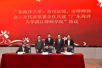 活动中,在黄勇武副市长、彭权群副书记、陈伟斌书记、李军二级调研员的见证下,张显伟院长、颜战克局长、李峰会长分别代表广东海洋大学、湛江市司法局、湛江市律师协会签署了合作共建“广东海洋大学湛江律师学院”协议。