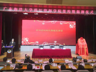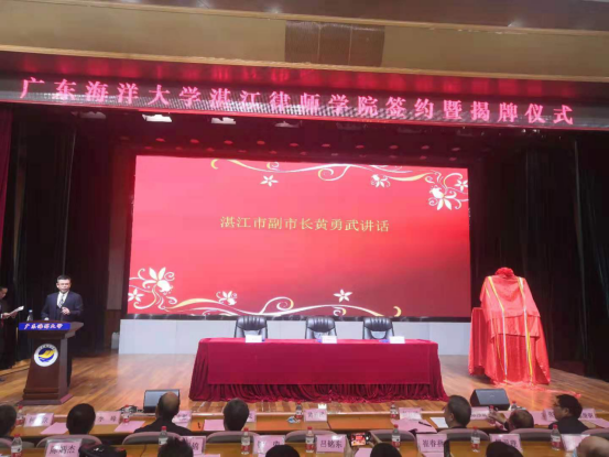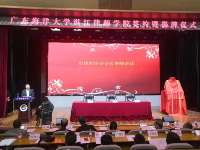 2020年12月29日上午9时,广东海洋大学、湛江市司法局、湛江市律师协会合作共建“广东海洋大学湛江律师学院”签约暨揭牌仪式在广东海洋大学顺利举行。湛江市人民政府黄勇武副市长、市司法局颜战克局长、市律师协会李峰会长、广东海洋大学党委副书记纪委书记彭权群、社团学姐