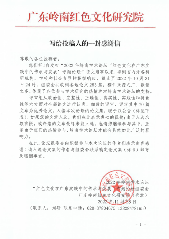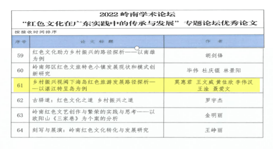 聂爱文教授指导社会学专业同学撰写的《乡村振兴视阈下海岛红色旅游发展路径探析—以湛江特呈岛为例》一文,参加广东省社科联2022年岭南学术论坛“红色文化在广东实践中的传承与发展”专题论坛征文比赛,获得优秀论文奖,并入编本次论坛的论文集。