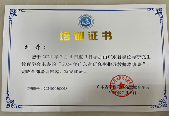 教师刘升副教授于2024年7月4—5日参加广东省学位与研究生教育学会举办的“2024年广东省研究生指导教师培训班(第二期)”。