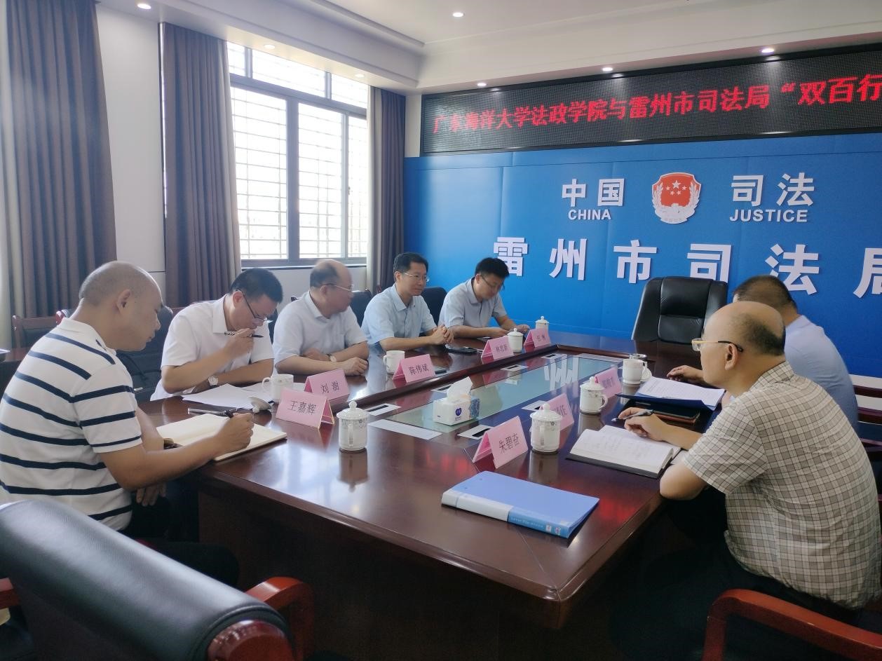 党委书记林忠新、院长陈伟斌、副院长刘澍一行,在“双百行动”雷州工作队队长伍彬(我校食品科技学院党委书记)、副队长王嘉辉(广东生态工程职业学院)的协助下,与雷州市司法局局长郑俊升、副局长周振宁等就如何落实和开展“双百行动”展开了座谈。座谈会上,双方围绕产业发展、公共服务、建设规划、环境保护、区域法治等主题交换了意见。在此基础上,广东海洋大学社团学姐