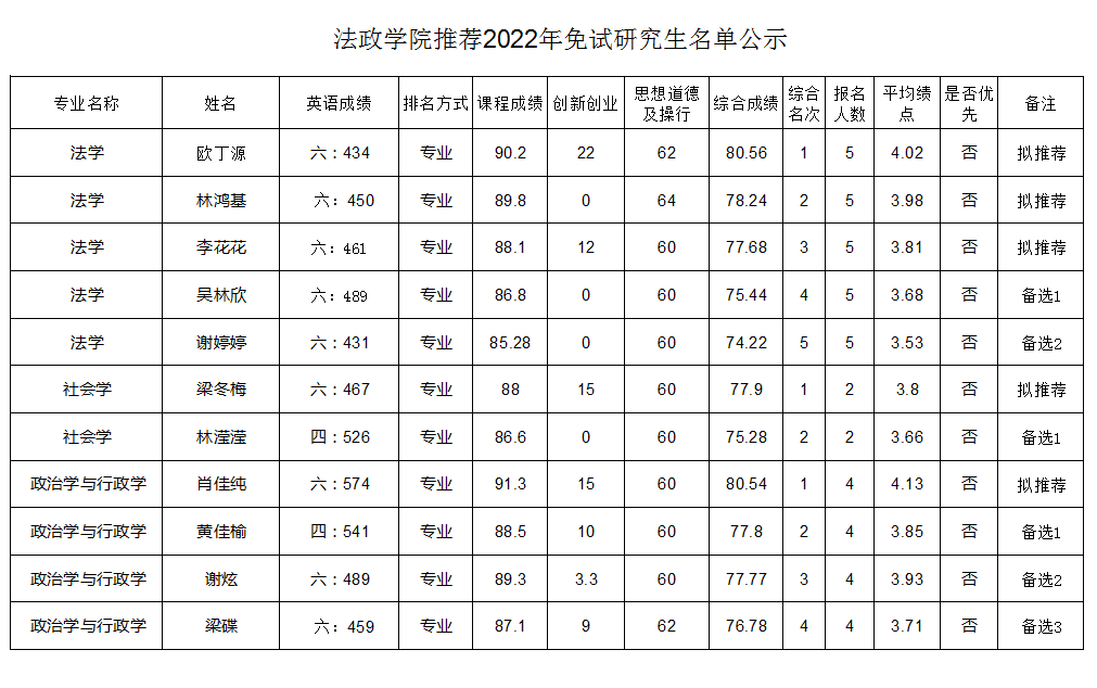 推荐优秀应届本科毕业生免试攻读研究生遴选细则》,学院组织了推荐优秀应届本科毕业生免试攻读研究生遴选工作。经本人申报,学院遴选工作小组审核评定后公示。因公示存有个别异议,学院遴选小组征询相关职能部门后对异议点进行审校。根据综合成绩名次排序,拟向学校推荐欧丁源等5名学生免试攻读研究生。现对相关情况予以公示(详情见下图)。