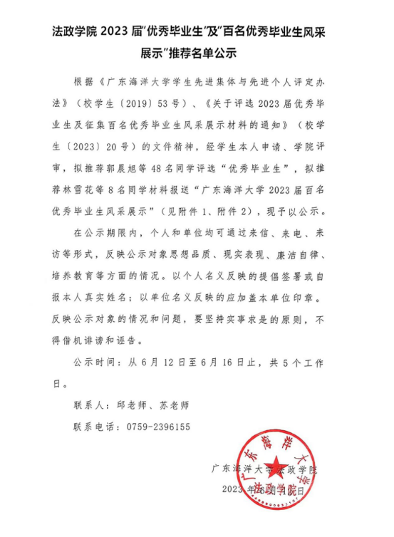 根据《广东海洋大学学生先进集体与先进个人评定办法》(校学生〔2019〕53号)、《关于评选2023届优秀毕业生及征集百名优秀毕业生风采展示材料的通知》(校学生〔2023〕20号)的文件精神,经学生本人申请、学院评审,拟推荐郭晨旭等48名同学评选“优秀毕业生”,拟推荐林雪花等8名同学材料报送“广东海洋大学2023届百名优秀毕业生风采展示”(见附件1、附件2),现予以公示。