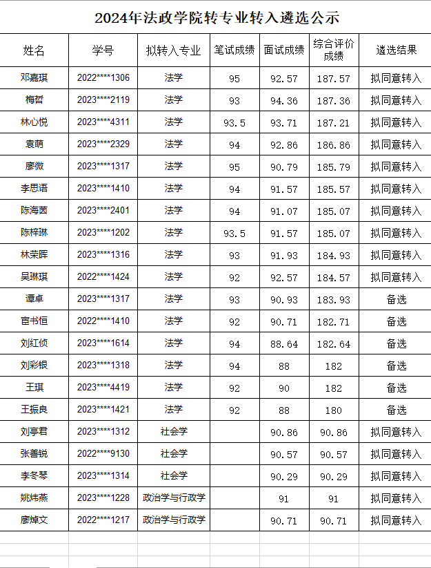 全日制本科生转专业学生遴选办法》,学院组织了转专业转入遴选工作。经学生申报笔试、面试考核,学院转专业工作委员会根据综合成绩进行了排序和遴选,拟同意邓嘉琪等15名学生转入社团学姐